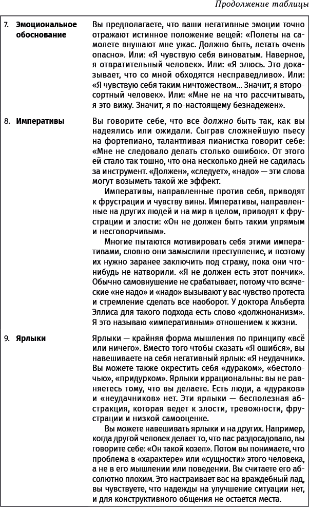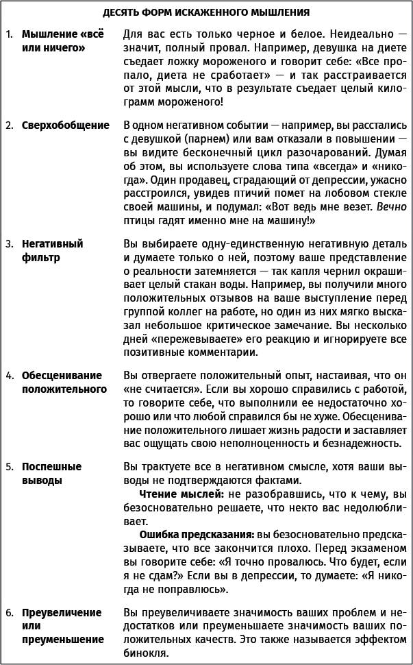 Одно из искажений — мышление «всё или ничего»: Джоанна уверена, что если она не добивается потрясающих успехов и не зарабатывает ежемесячно целое состояние, значит, она полная неудачница. Вам это может показаться нелепым: прибыль размером $4000 в месяц едва ли стоит называть неудачей. Однако Джоанне это кажется провалом — из-за ее перфекционизма. Она рассуждает так: «Я чувствую себя полной неудачницей, значит, так и есть». Это иллюстрация второго искажения, эмоционального обоснования: Джоанна полагает, что ее негативные чувства отражают истинное положение вещей.
