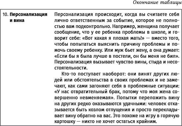 Некоторые читатели могут подумать, что я нападаю на Мардж. Может быть, вам уже хочется ее защитить: «А вдруг Джордж и правда козел? Может, у него роман на стороне. Может, у Мардж есть право злиться?» Конечно, иногда злость бывает здоровым и уместным чувством. Но бывают и такие случаи, когда мысль не соответствует действительности и, следовательно, злость не слишком оправданна. И даже если кто-то ведет себя с вами несправедливо, ваши чувства все равно будут обусловлены тем, что вы сами думаете о происходящем. Если вы видите ситуацию, из-за которой искренне расстроились, в искаженном свете, то ваши чувства раздуваются настолько, что решить настоящую проблему будет сложнее. Если же вы посмотрите на нее более реалистично, вам будет проще выразить свои чувства в конструктивной форме и не вынуждать другого человека занимать оборонительную позицию, выслушивая вас.