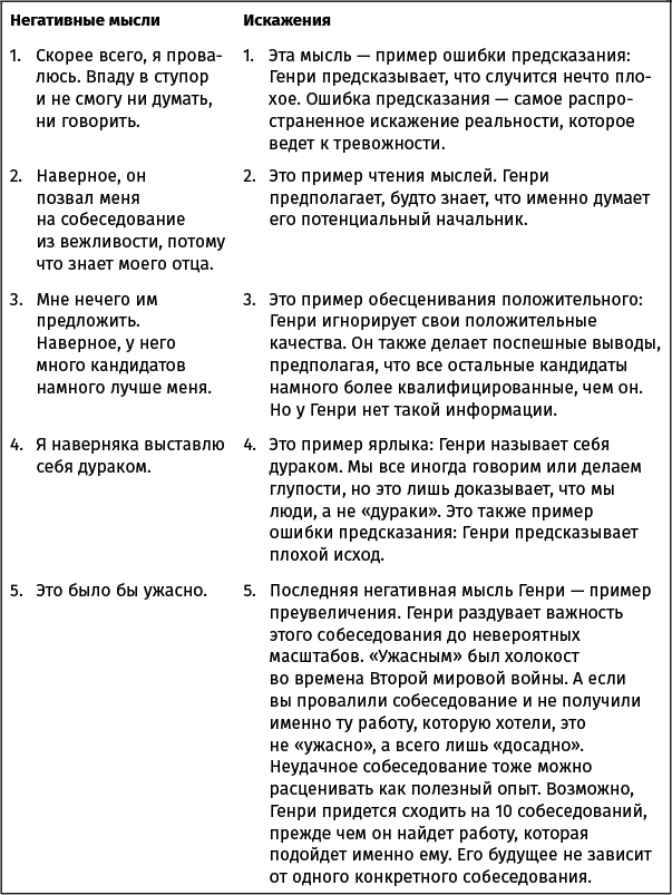Генри тревожился перед важным собеседованием. Я перечислил его негативные мысли в левой колонке. Закройте правую колонку и посмотрите, сможете ли вы определить искажение реальности в каждой из его мыслей. Если хотите, можете подсматривать в список.