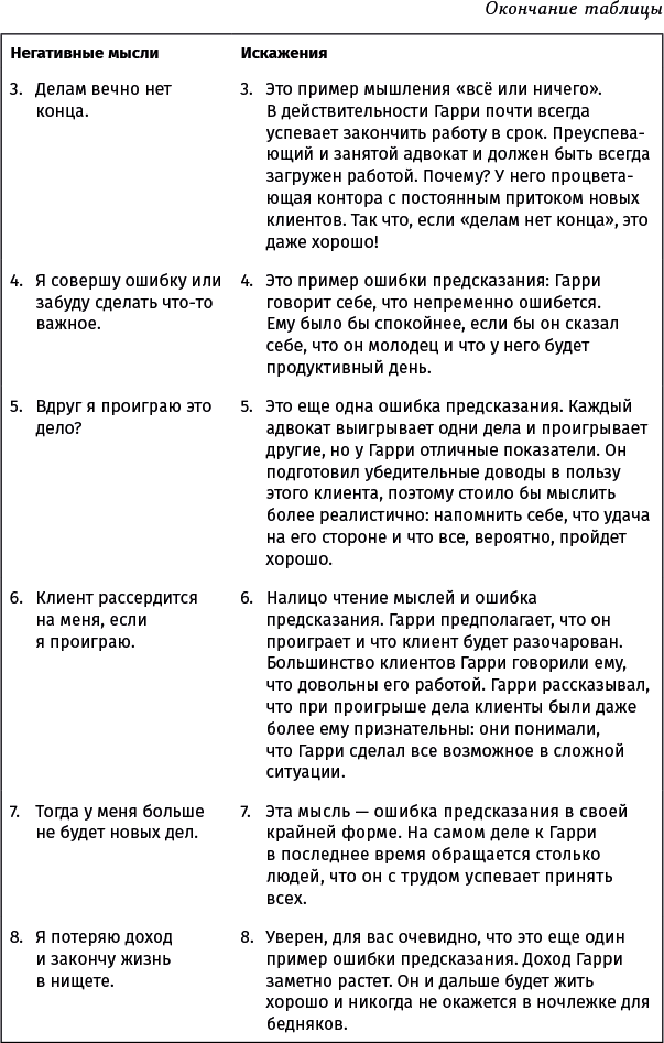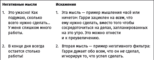 Гарри — успешный адвокат. Всякий раз, заходя утром в офис, он чувствует напряжение. Похоже, он просто не может расслабиться и не получает удовольствия от работы. Негативные мысли, перечисленные ниже, переполняют его голову, когда он садится за свой стол. Закройте правую колонку и посмотрите, сможете ли вы найти в них искажения реальности, используя список.