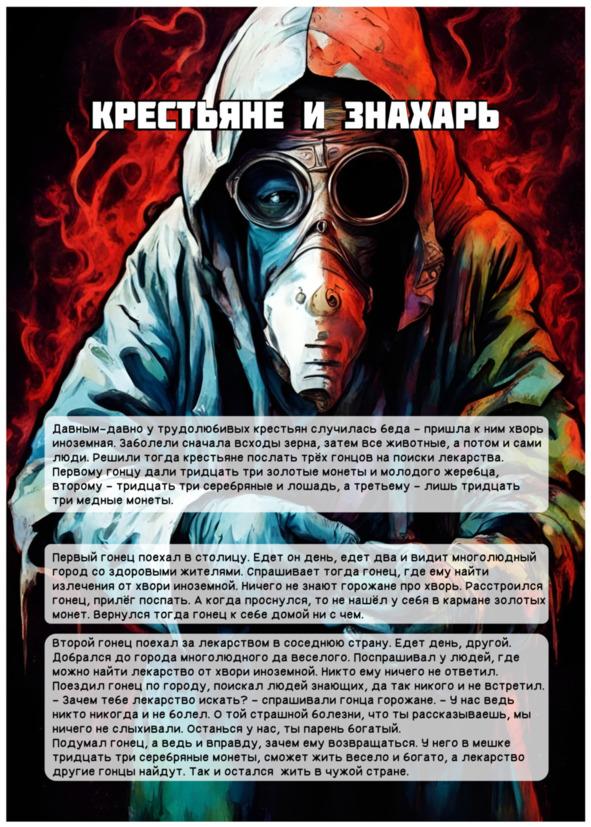 Тем временем в наших историях крестьяне и знахарь покажут, почему важно лечиться бесплатно, Черные пауки сплетут сеть сбора информации, а богатырь запустит в небо быка. И вы не догадаетесь, какие еще права и свободы будут обыграны в сказаниях.