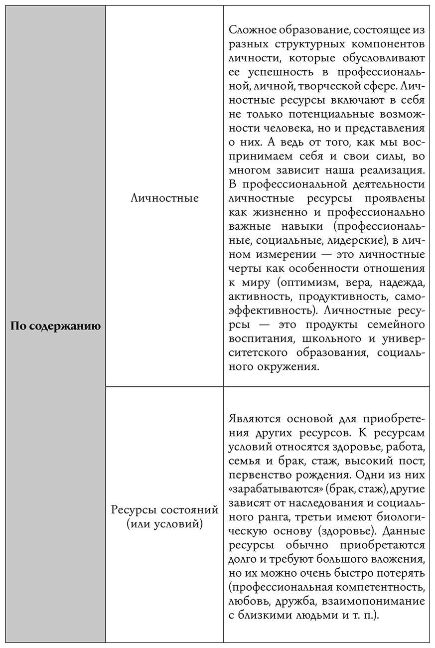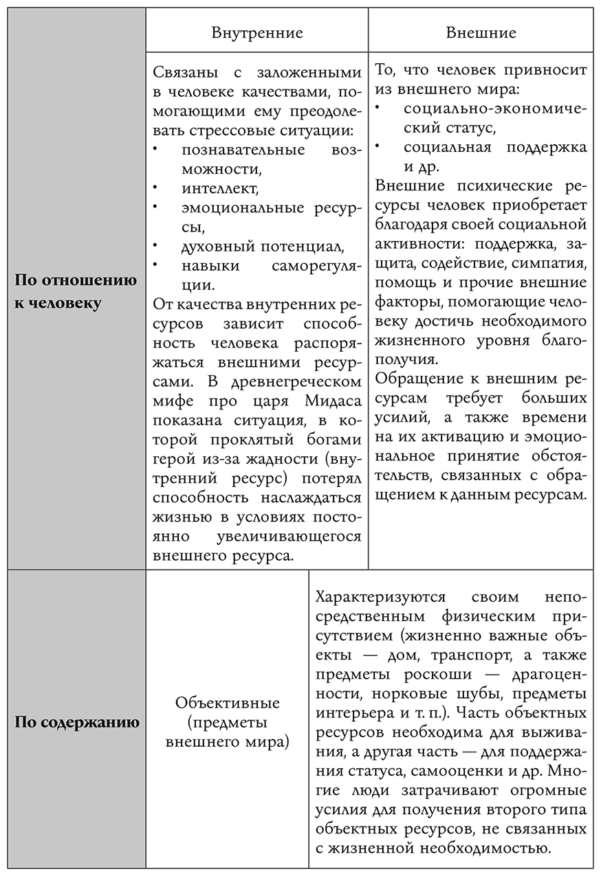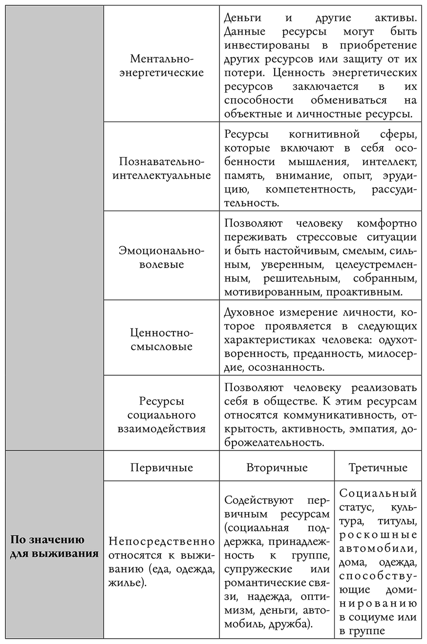 Один из ведущих мировых специалистов в области психологии стресса и автор теории сохранения ресурсов, профессор Кентского университета С. Е. Хобфолл разработал классификацию ресурсов в трех разных плоскостях{4}: