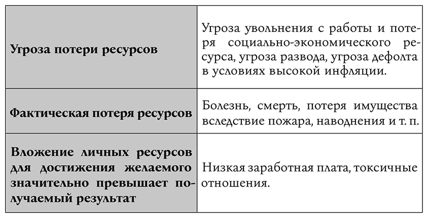 Согласно С. Е. Хобфоллу, стресс возникает в следующих ситуациях: