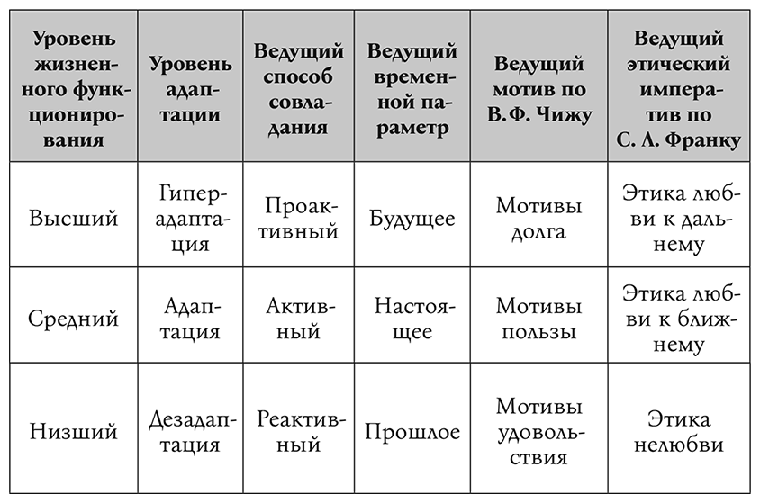 На низшем уровне жизненного функционирования находятся плохо адаптированные люди, использующие, как правило, реактивные способы совладания, руководствующиеся «этикой нелюбви» и мотивом непосредственного удовольствия. На среднем уровне располагаются хорошо адаптированные люди, использующие, как правило, активный тип совладания (антиципаторно-превентивный), они руководствуются этикой «любви к ближнему» и мотивами пользы утилитаристов. На высшем уровне располагаются гиперадаптированные люди, использующие в своей жизни проактивные способы совладания, руководствующиеся этикой «любви к дальнему» и мотивами долга. Согласно теории А. Ф. Лазурского, представители высшего уровня альтруистичны и ориентированы на будущее. Ведущим временным параметром для них является будущее.