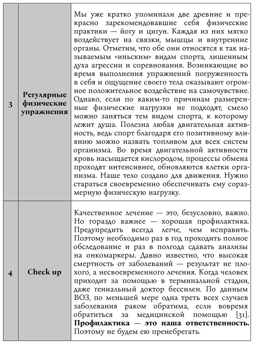 Наша психика так устроена, что далеко не всем и не всегда бывает под силу соблюдать норму и меру. За миллионы лет эволюции живые организмы были приучены к тому, что предел потребления им устанавливает природа. Обезьяна съедает обнаруженный банан немедленно, пока его не съели другие. Человек же научился управлять природой. Условно говоря, он располагает неограниченным количеством бананов. И сколько он их съест – решать ему самому, поэтому научиться себя контролировать необходимо. Наше ТЕЛО – это не просто «дом», в котором живет наша душа. Это важнейший ресурс, точнее, основа всех ресурсов. Нормальное функционирование тела – это conditio sine qua non, т. е. условие, без которого невозможно развиваться. Мы должны держать наше тело в порядке, как хороший солдат держит в порядке свой автомат или как гонщик – свой автомобиль. Почему, когда под капотом автомобиля нам слышится подозрительный стук, мы тут же едем в автосервис, а когда «стучать» начинает у нас в груди, к врачам обращаются лишь немногие? Это деструктивное поведение, которое ведет в тупик. Диагностика и предупреждение заболеваний, регулярный healthcheck, физические нагрузки, здоровый образ жизни – забота о здоровье тела должна стать нормой жизни. Ведь это наш ресурс.