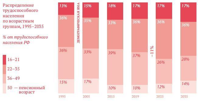 Сотрудников в возрасте 20–24 лет становится всё меньше, и компаниям приходится всё более жёстко за них конкурировать. Растёт спрос на качественные кадры и в других возрастных группах. С одной стороны, нас догнала демографическая яма и людей становится меньше, а с другой, потребность компаний выросла на 20 % в 2021 году и на 22 % в 2022 году относительно предыдущих периодов. В марте в аудиторско-консалтинговой сети FinExpertiza опубликовали исследование, согласно которому в четвёртом квартале 2022-го на каждого безработного россиянина приходилось сразу 2,5 вакансии. Это максимум с 2005 года. Поэтому уже сейчас с дефицитом сталкивается 80 % компаний.
