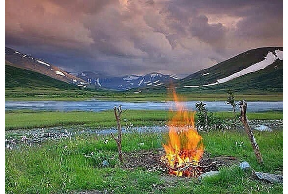 Берег, к которому они причалили, не располагал к ночлегу, мало деревьев, кустарника, а вечер надвигается быстро. И друзья снова отправились в путь, высматривая на берегах реки завалы из деревьев, брёвен, кустов, которые прибиваются половодьем. Наконец-то, нашли то, что искали. Причалили. Берег каменистый, широкий. Собрали довольно большой «урожай» из сухостоя. Здесь и тонкие сухие деревца, и обрывки брёвен. Хватило сложить большой костёр, можно даже сказать кострище. Метра два в диаметре. Горел он более часа. Успели и рыбку зажарить, и чай вскипятить и попить, с бутербродами и печеньем.