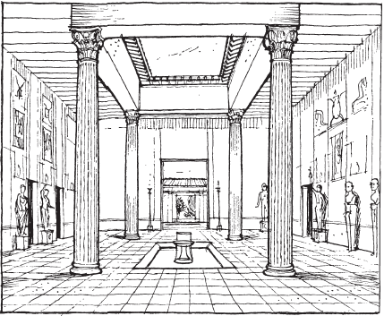 Когда римляне стали богаче, они добавили к этому атрию второй дом. Он строился по греческому образцу и назывался перистиль, что значит «часть здания, окружающего двор». В более просторных жилищах богатых римлян и в провинциальных городах, таких как Помпеи, этот внутренний двор становился садом. В Риме многие состоятельные люди были вынуждены довольствоваться садами на крыше солнечной террасы, где, по-видимому, находились плодовые деревья и пруды с рыбой. Семейные спальни, домашний алтарь, очаг и кухня, столовая и книгохранилище или библиотека, если владелец интересовался литературой, находились в таком перистиле.