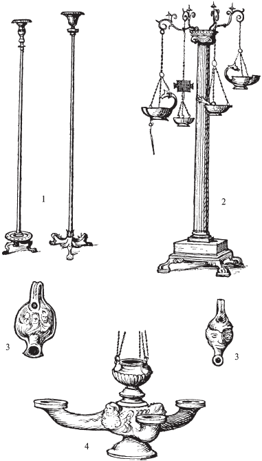 Рис. 5. Освещение в домах римлян: 1 – серебряные подсвечники; 2 – бронзовый светильник; 3 – керамические лампы; 4 – подвесная лампа