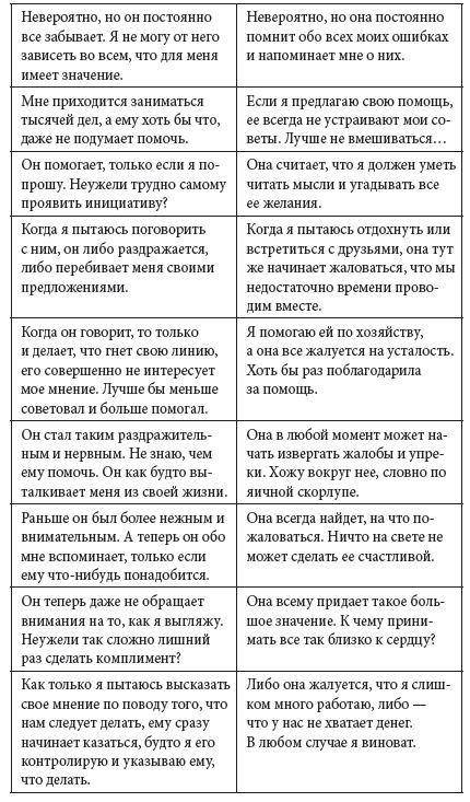 Эта важная перемена в восприятии позволит вам создать условия для любви на всю жизнь. Ситуации, описанные в этой главе, показывают лишь некоторые из типичных конфликтов, возникающих между мужчинами и женщинами. Взгляните, применимы ли к вам эти распространенные жалобы или горячие точки в отношениях, с которыми мне часто приходилось сталкиваться во время консультирования семейных и одиноких мужчин и женщин.