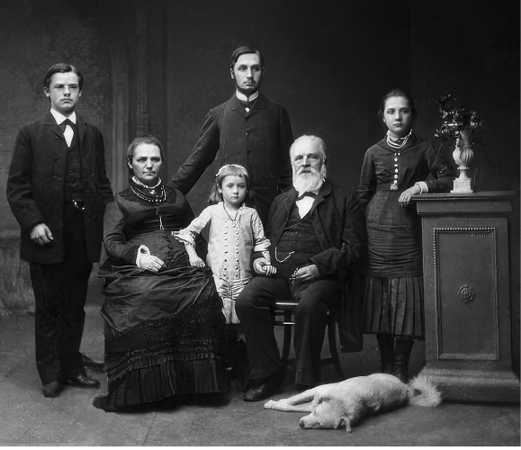 Семья Мюнтер (слева направо): Карл, мать Минна, Аугуст, в центре — малышка Габриэле, отец Карл Фридрих и Эмми. Около 1882 г.