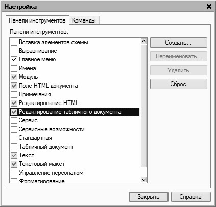 Изначально на вкладке Панели инструментов представлен перечень системных инструментальных панелей, заложенных в конфигурации. Эти панели нельзя переименовывать либо удалять. Однако пользователь может самостоятельно создать любое необходимое количество пользовательских инструментальных панелей.