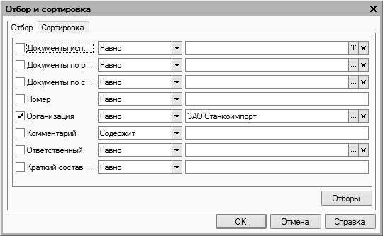На вкладке Отбор осуществляется настройка параметров фильтра. В левой части вкладки содержатся возможные условия фильтра. Для выбора требуемого условия необходимо установить соответствующий флажок. Справа с клавиатуры указывается конкретное значение выбранного фильтра: например, на рис. 2.7 выбран фильтр Организация, а значение фильтра — ЗАО Станкоимпорт. Между условием фильтра и его значением из раскрывающегося списка следует выбрать вариант применения фильтра (Равно, Не равно, В списке, Не в списке и др. — у разных условий фильтра могут быть разные варианты применения). Например, на рис. 2.7 для фильтра Организация выбран вариант Равно. Это означает, что после применения фильтра в списке останутся только позиции для организации ЗАО «Станкоимпорт». Если же установить вариант Не равно, то из списка будут исключены все позиции кроме тех, которые относятся к организации ЗАО «Станкоимпорт» (иначе говоря, с помощью варианта Не равно включается обратный фильтр).