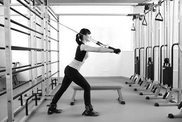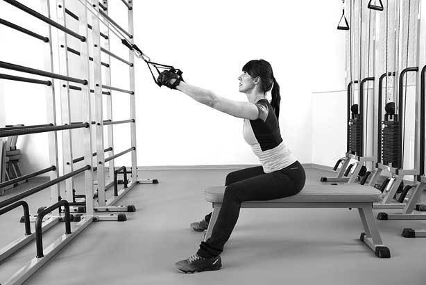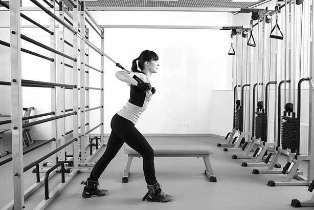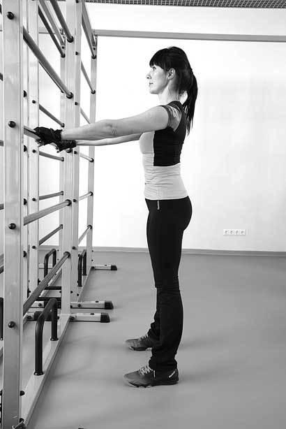 Третье упражнение. Прикрепить резиновый бинт к неподвижной опоре на высоте груди. Став спиной к опоре, поочередно выпрямляйте руки с резинкой вперед, как будто отжимаетесь (фото 11 a, б). Тело при жимах вперед следует слегка скручивать в грудном отделе.