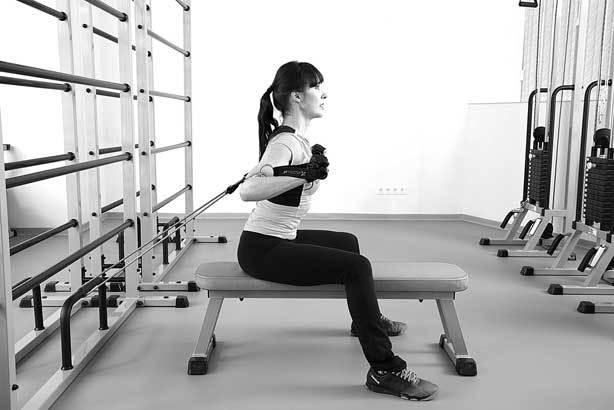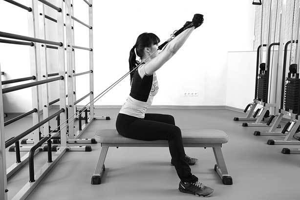 Второе упражнение с резиновым бинтом. Сидя на скамье, спиной к неподвижной опоре, за нижнюю точку которой зафиксирован резиновый бинт, поднимайте руки вверх, как будто поднимаете гантели (фото 10 a, б). Это упражнение нужно выполнять через день, делая две-три серии по 10–20 повторений. При этом может раздаваться хруст или скрип в области плеча и лопатки, но их можно не бояться – это упражнение безопасно.