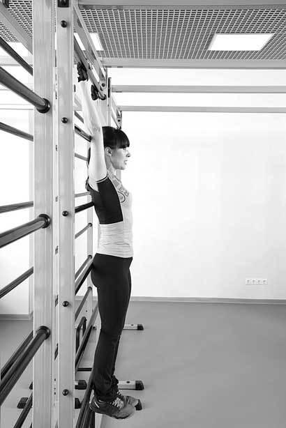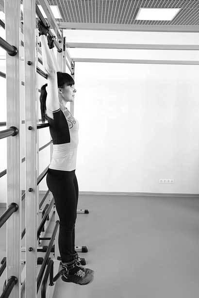 Первое упражнение – подтягивания. Установите в дверном проеме (а если вы живете в деревне, то лучше во дворе) прочную перекладину таким образом, чтобы эта перекладина была на высоте поднятых вверх рук, а тело полностью лежало на полу. Попробуйте подтянуться на руках (фото 8 a, б). Предупреждаю, что это будет непросто, но вы не отчаивайтесь: через одну-две недели вы почувствуете, что боль и неприятные ощущения уходят и упражнения доставляют вам радость. Подтягивания на руках надо делать не более трех раз в неделю. Каждый раз поднимайте турник (перекладину) выше, чтобы тело было под углом 45 градусов.