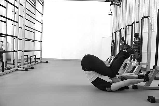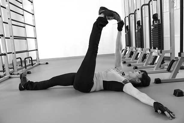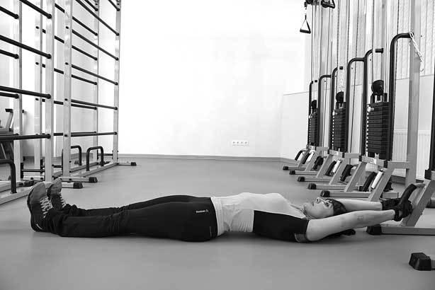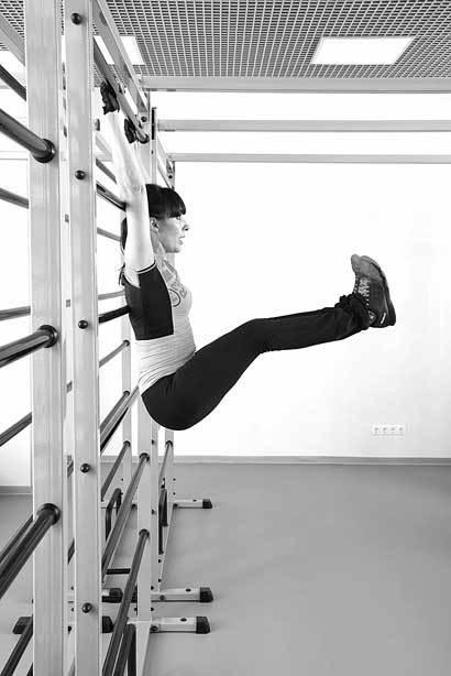 Соблюдайте принцип последовательности и постепенности. Начинайте с простых, доступных вам упражнений и усложняйте программу занятий постепенно, ежедневно увеличивая количество подходов к этим упражнениям. И помните: главное – регулярность! Занимайтесь ежедневно по 30–40 минут, а любимые упражнения можно делать несколько раз в день – например, подъем коленей к груди (фото 3 а, б)/животу (фото 4 а, б) в висе на перекладине или опускание ног за голову (фото 5 а, б, в) лежа на спине и держась руками, например, за диван.