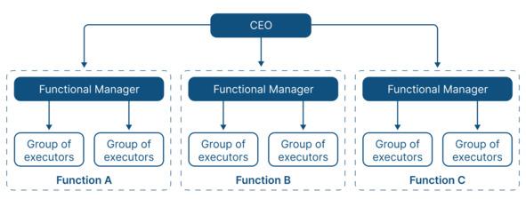 The simplest model: straight and hierarchical. Key decisions are made from the top, and they go down without any separate functions: sales, marketing, production. Suitable for small companies with simple manufacturing technology and minimal need for additional features.