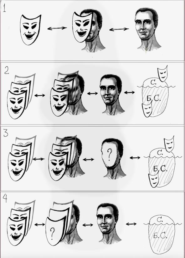 Но если представить, что человек с рождения носит маски, сменяя их в зависимости от социальной роли, и никогда не открывает своего лица и не знает своего лица, то схема становится понятной.