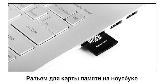 Вы, конечно, можете подключить все эти устройства при помощи провода, как мы писали выше. А можно вынуть карту памяти (о том, как это сделать, написано в руководстве к телефону, книге, фотоаппарату) и вставить в специальный разъем ноутбука.
