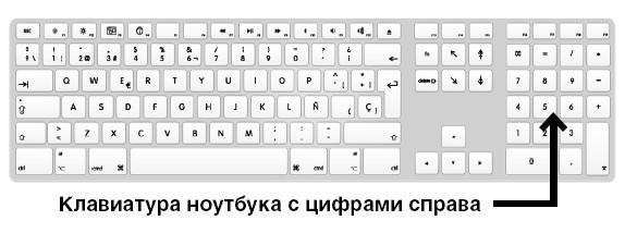 Клавиатуры ноутбуков могут быть устроены по-разному. У больших ноутбуков справа могут быть дополнительные клавиши с цифрами. У маленьких (по размеру) таких клавиш нет. Кроме того, клавиши могут отличаться по форме и расположению.