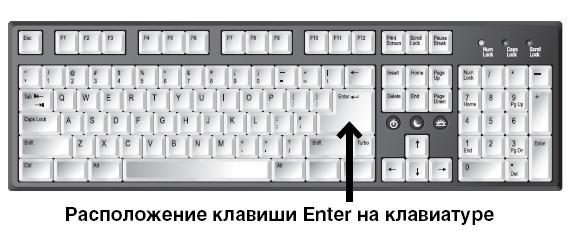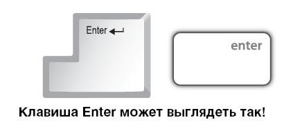 Клавиша Enter (энтер) расположена с правой стороны от кнопок с буквами. На некоторых клавиатурах на клавише не обозначено название, а нарисована только стрелка, согнутая под прямым углом. Это одна из основных кнопок, используемых при любой работе на компьютере.