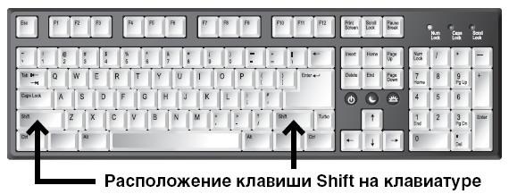 Эта клавиша делает букву заглавной (большой) и помогает печатать то, что размещено на кнопках с несколькими символами в верхней строке, например на кнопках с цифрами (об этом чуть ниже).