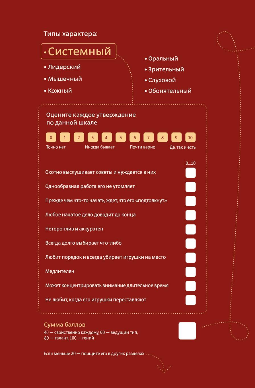 Для того чтобы понять, черты какого типа есть у вас и вашего ребенка, перед каждой главой оцените 10 утверждений. Чувствительность в 40 баллов свойственна для каждого человека. Если сумма получится 60 баллов — значит, этот тип характера в вашем ребенке является ведущим. Чувствительность 80 уже говорит о таланте, а 100 — о проявлении гениальности ребенка в областях, свойственных конкретному типу характера.