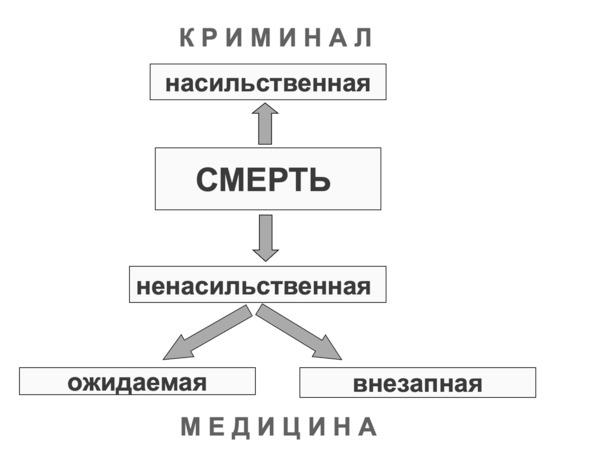 Все виды смерти можно условно разделить на 2 категории: насильственная (это предмет криминалистики и судебных разбирательств) и ненасильственная, связанная с болезнями и лежащая в сфере медицинской практики.