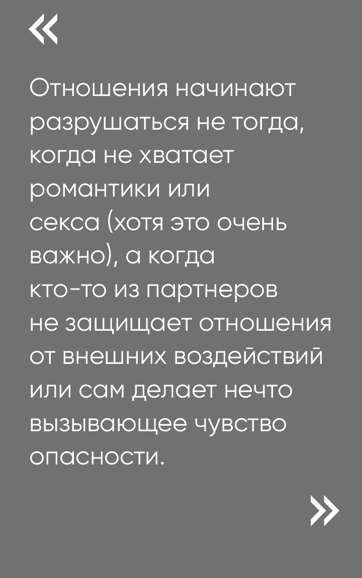 Что самое главное в отношениях в паре? Чувство безопасности и надежности — проще говоря, уверенность в том, что тебя не предадут. Отношения начинают разрушаться не тогда, когда не хватает романтики или секса (хотя это очень важно), а когда кто-то из партнеров не защищает отношения от внешних воздействий или сам делает нечто вызывающее чувство опасности. Очень часто к внешним опасностям относятся мнения, оценки, поступки родительской семьи — например, недовольство его партнершей или попытки обесценить ее.