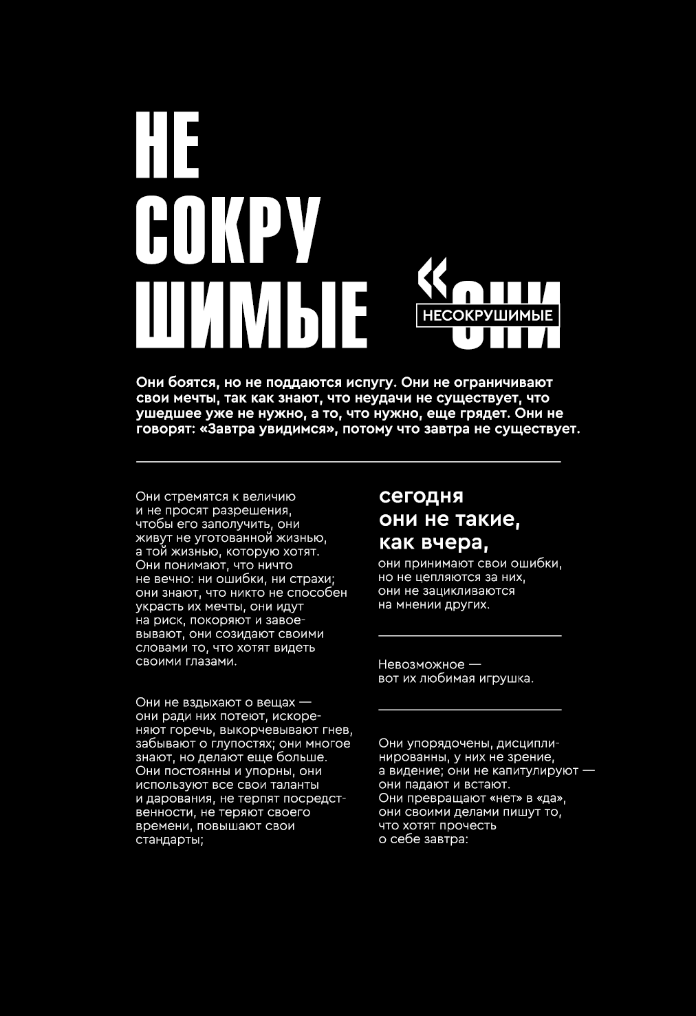Мы заново откроем тот бесконечный потенциал, который заключен в вас, в вашей уникальности, в том, что отличает вас от всего сущего в безмерном космосе. Мы докажем, что мы и есть Несокрушимые.