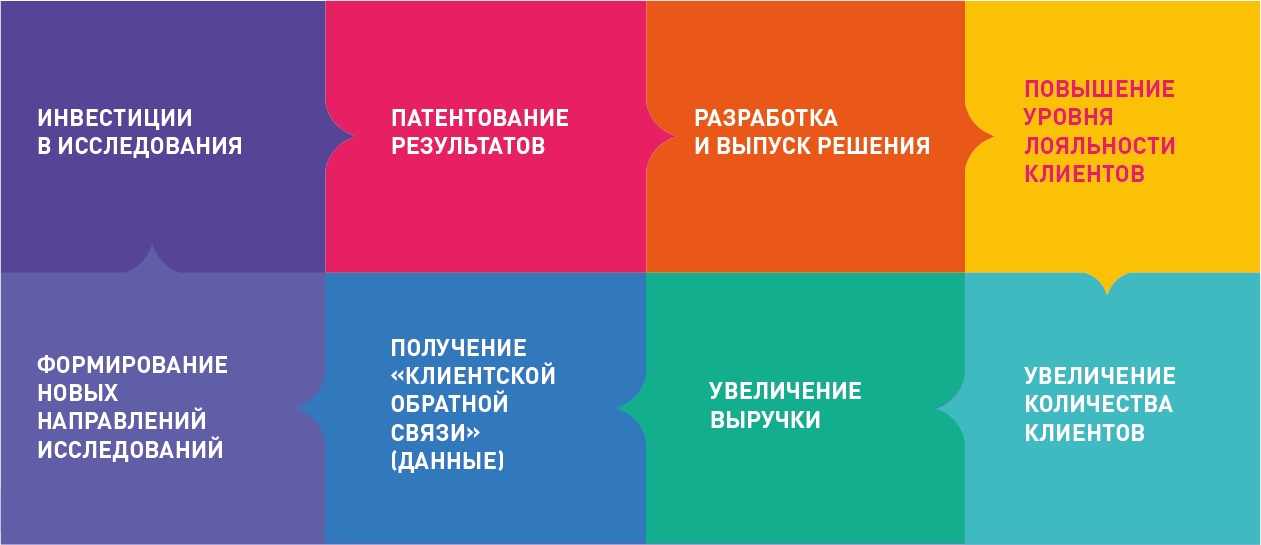 Для достижения лидерства в своей индустрии компании вынуждены быть инновационными, то есть не только инвестировать в повышение эффективности производства и взаимоотношения с клиентами, но и проводить научные исследования, делать свои решения технологичнее, внедряя самые современные инновации, обогащать их новыми сервисами и свойствами… Все это требует от лидеров рынка и их конкурентов проведения политики новых научно-технических открытий, защиты интеллектуальной собственности, формируя тем самым круговорот инновационной деятельности (рис. 1).