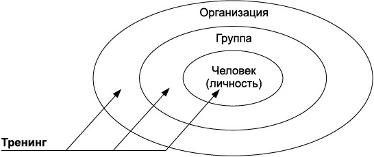 Из вышеперечисленных определений видно, что современный термин «тренинг» охватывает обширную область практической психологии и педагогики, пересекающуюся с групповой психотерапией, психокоррекцией и обучением, позволяющими качественно по-новому, на высоком уровне работать с тремя взаимосвязанными феноменами: человеком (личностью), группой (коллективом) и организацией (предприятием, фирмой) (рис. 2).