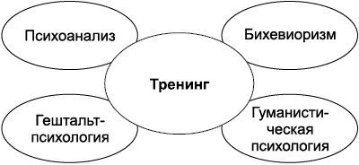 Рис. 1. Тренинг как форма активной групповой работы на стыке основных направлений мировой психологической науки