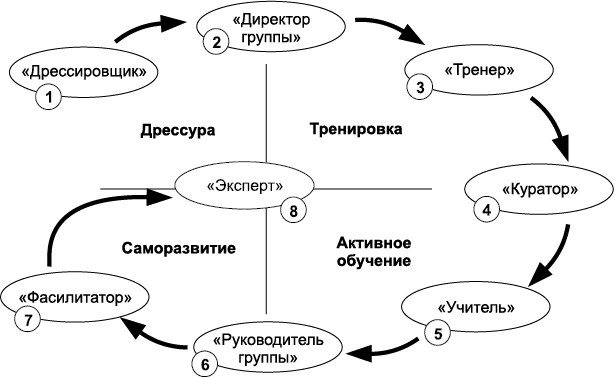 Начинающий тренер зачастую работает как «Дрессировщик», поскольку испытывает страх перед группой и пытается провести тренинг обязательно так и в такие сроки, как запланировано по программе, не обладая еще гибкостью и пластичностью опытного тренера. Переборов страх и набравшись опыта, он становится «Директором группы», через какое-то время «Тренером», затем «Куратором», потом «Учителем», далее «Руководителем группы», после чего «Фасилитатором» и наконец «Экспертом».