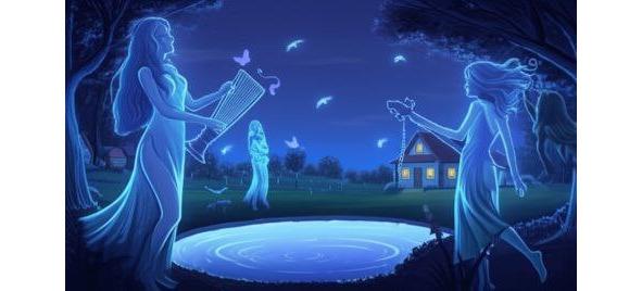 Расстёгиваю замок палатки и смотрю на голубую воду. Как вдруг из неё начинают вылетать синие бабочки, на суше появилась арфа, выходили из глубины озера русалки. Одна из них принялась играть на арфе. Только русалка дотронулась струны и сыграла пару нот, как из воды вылетела стая птиц и кружилась над озером. Другая русалка достала из воды скрипку и начала играть на одной волне с первой русалкой.