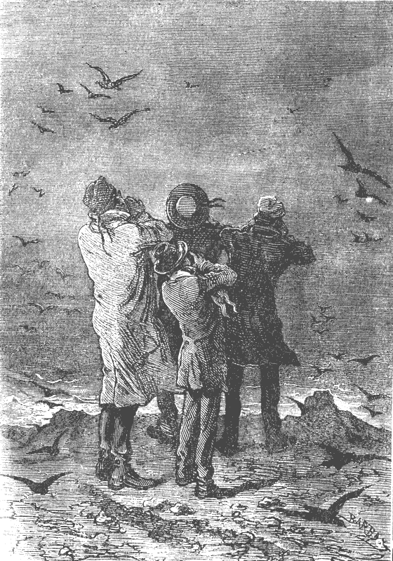 Ця суцільна стіна складалася з дуже твердого граніту, який ніколи не розмивали води моря. Над скелею літало багато водяних птахів з породи лапчастоногих, з довгими, гострими дзьобами; вони літали з голосними криками, не лякаючись людей, які, напевне, вперше порушили спокій цього пустинного місця. Пенкроф упізнав кілька різних порід чайок. Досить було одного пострілу по цій пташиній зграї, щоб убити їх дуже багато, але для того щоб вистрелити, треба було мати рушницю, якої не було ні у Пенкрофа, ні в Харберта. До того ж ці чайки зовсім не придатні для їжі, а яйця їх дуже несмачні.