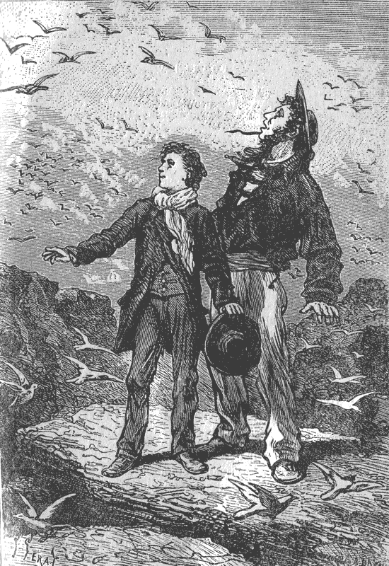 Через деякий час вони повернулися, йдучи південним боком гранітного плато, оточеного високими, химерними скелями, які мали дуже дивну і мальовничу форму. Там було багато птахів, які вили гнізда в розколинах скель. Харберт, стрибаючи по скелях, зігнав цілу зграю цих птахів.