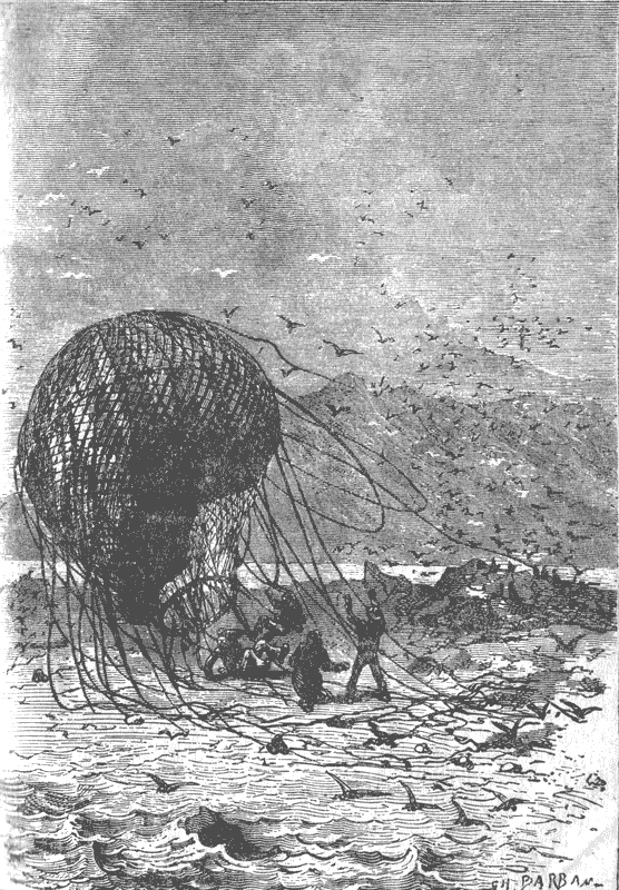 До землі залишалося тільки два кабельтових[3], коли крик жаху вирвався одночасно з чотирьох грудей. Аеростат, який, здавалося, не міг більше піднятись, зробив ще один несподіваний стрибок, після того, як його вдарило великою хвилею. Немов одразу полегшений від частини свого вантажу, він рвучко піднявся вгору на тисячу п'ятсот футів і там потрапив у повітряний потік, який поніс його майже паралельно берегові. Нарешті, через дві хвилини, він навскоси наблизився до суходолу і впав на прибережний пісок, куди не доходили хвилі.
