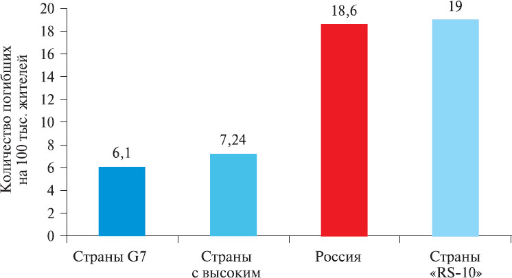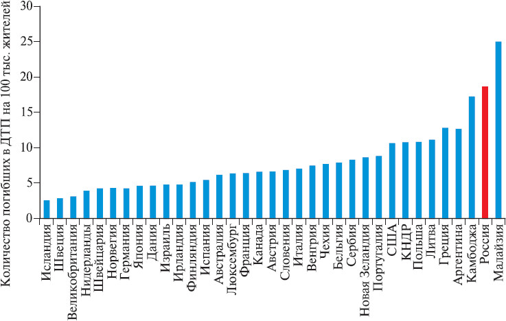 К числу наиболее распространенных относится показатель социальных рисков (human risks – RH), определяемый по числу погибших в расчете на 100 тыс. жителей (рис. 1). Этот показатель необходим для сравнения смертности на дорогах с прочими причинами массовой убыли населения в той или иной стране в рамках упомянутого выше рейтинга ВОЗ.