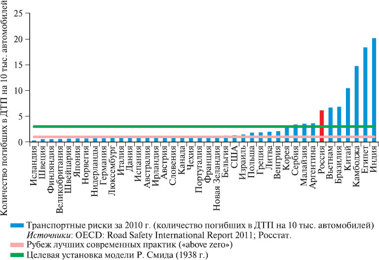 Случилось, однако, так, что в первой половине 2013 г. наш Институт оказался вовлеченным в подготовку аналитического доклада Экспертного совета при Правительстве Российской Федерации, посвященного проблемам безопасности дорожного движения и путям их решения. Эта деятельность была связана, в частности, с определенным переосмыслением перспектив имплементации в России лучших мировых практик, а также существенным расширением междисциплинарного горизонта при изучении динамики и структурных различий транспортных рисков.