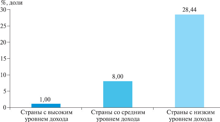 Прежде всего бросается в глаза огромный разрыв между «эпидемиологическими очагами» смертности на дорогах и местами наибольшей концентрации автомобилей – потенциальных носителей этой специфической «инфекции». Большинство (91,5 %) случаев смерти на дорогах происходит в странах с низким и средним доходом, на долю которых приходится менее половины (48 %) мирового парка транспортных средств (рис. 6, 7). При этом около 51,2 % зарегистрированных дорожно-транспортных травм со смертельным исходом происходит в странах группы «Risky States-10» («RS-10»). В последние годы Всемирной организацией здравоохранения реализуется проект «RS-10», который направлен на снижение смертности на дорогах в странах, входящих в эту группу, и спонсируется благотворительным фондом Bloomberg Philanthropies. В группу «RS-10» входят: Китай, Индия, Бразилия, Камбоджа, Египет, Кения, Мексика, Турция, Вьетнам, Россия. А это 48,5 % населения мира, на которые приходится 38,7 % мирового парка автомобилей (см. табл. 1).