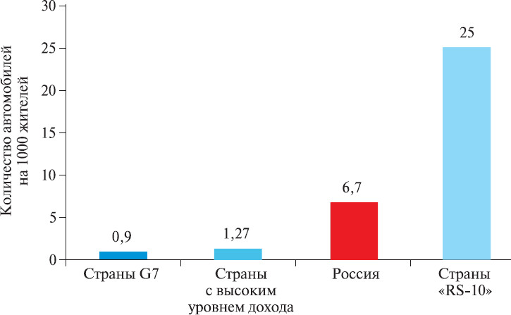 Сегодня этих «вещей» на душу населения приходится от 500–700 (Западная Европа, Япония, Канада, Австралия) до 840 штук (США). Разумеется, особого транспортного счастья при этом не наблюдается, но уровень транспортных рисков сведен к минимуму (above zero!), а условия движения обеспечивают (за вычетом неизбежных форс-мажорных эпизодов) приемлемые для автомобилистов затраты времени на перемещения в суточном цикле, а также, в первую очередь, нормальное функционирование наземного общественного транспорта и обеспечивающих грузовых логистик.