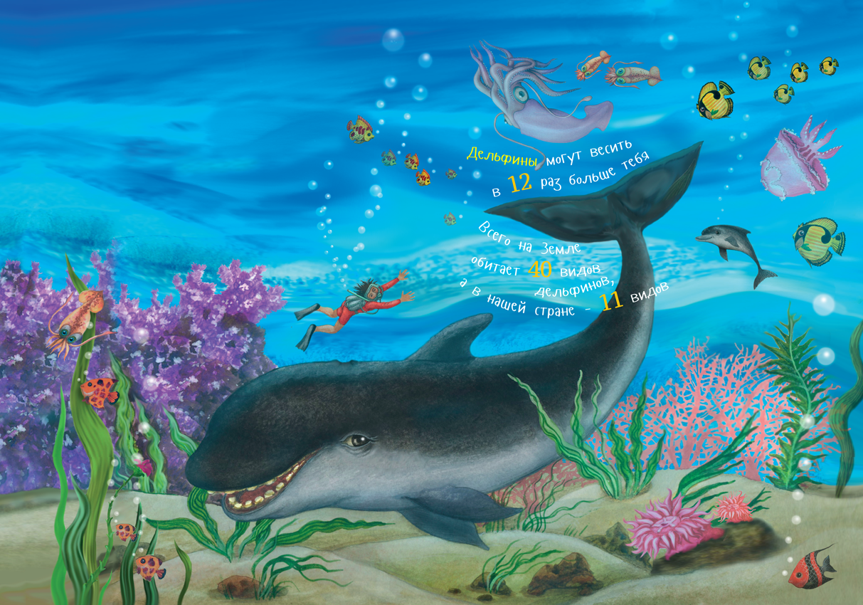 Дельфиньих родов миллион! Думаете, я сочиняю? Вообще-то, да... Но их правда много. Самый известный среди нас – афалина. Это мой вид, мы живём в Чёрном и Средиземном морях. Мы очень разные! Самые большие дельфины – косатки, они весят 8 тонн. Многие даже думают, что это настоящие киты – из-за их гигантского размера! Самые маленькие дельфины – мауи, обитающие в Новой Зеландии. Вес мауи около 50 килограммов, в 3–6 раз меньше, чем у меня.