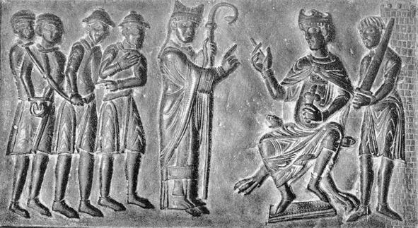 Адальберт Пражский обличает евреев, торгующих христианскими рабами, перед Болеславом II, герцогом Богемии. Рельеф с двери дворца в Гнезно (Польша). Источник: http://www.ejwiki.org/wiki/Файл:Gniezno_Boleslaus_II.jpg