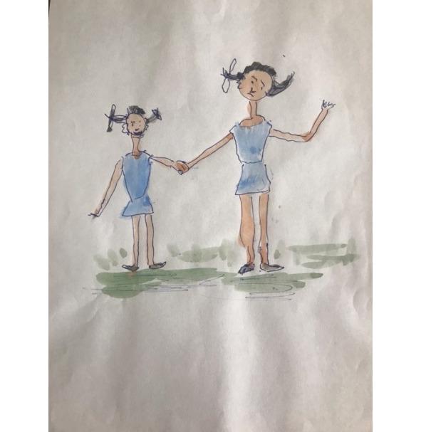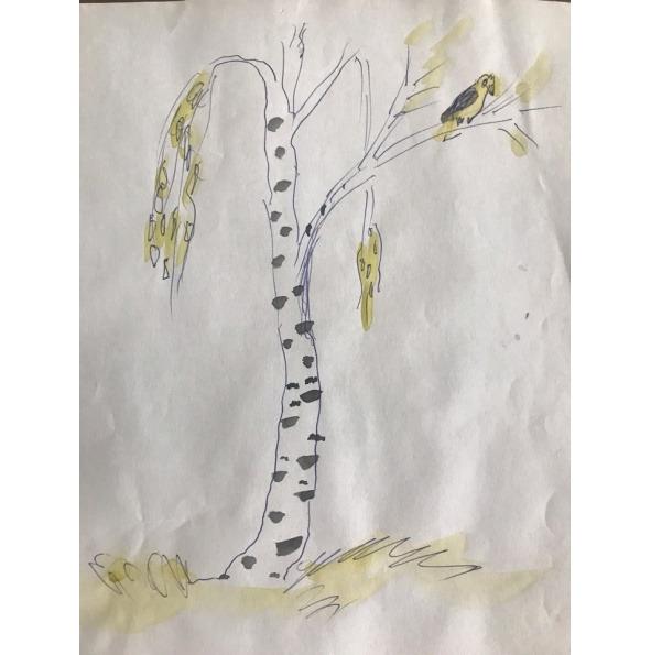 Вечером я забежала к родителям, папа мылся в ванной. Я прошмыгнула в комнату и заглянула в пакет. В альбоме — три рисунка. Цвета мало, в основном — контур шариковой ручкой, и чуть-чуть раскрашено. На первом листе — две девочки держатся за руки, одна побольше, другая поменьше. Это, конечно же, его внучки, мои дочери, но несколько лет назад. Значит, именно такими они запечатлелись в его памяти, а не такие, какие они сейчас, взрослые. На втором — одинокая берёза с птицей на ветке. На третьем — собака. Горбатенькая, с человечьими глазами, торчащим кверху хвостом. Здесь красок больше, даже некая живописность присутствует.
