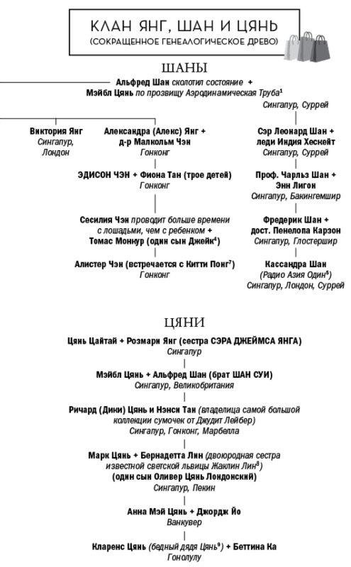 Николас Янг [1], вымотанный шестнадцатичасовым перелетом из Сингапура, поездкой из аэропорта Хитроу на поезде и «прогулкой» под проливным дождем по улицам Лондона, рухнул в ближайшее кресло в холле отеля. На соседнем месте стоически безмолвно дрожала Астрид Леонг, кузина Николаса. А все потому, что ее мать Фелисити, которую родные называли да гуцзе [2] — старшей тетушкой, заявила: дескать, грех брать такси, чтобы проехать девять кварталов, — и потащила всех пешком от станции метро «Пикадилли».