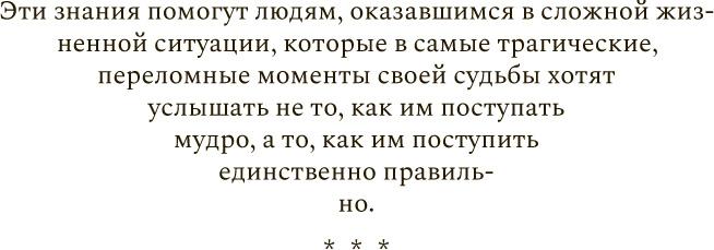 Эти знания и честные ответы на предложенные вопросы помогут людям, оказавшимся в сложной жизненной ситуации, которые в самые трагические, переломные моменты своей судьбы хотят услышать не то, как им поступать мудро, а то, как им поступить единственно правильно.