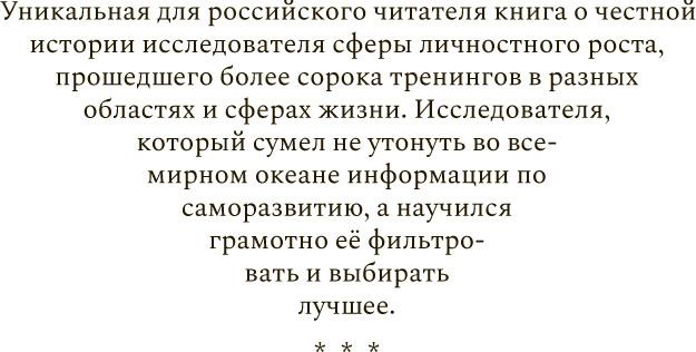 Это книга о честной истории исследователя сферы личностного роста, прошедшего более сорока тренингов в разных областях и сферах жизни. Исследователя, который сумел не утонуть во всемирном океане информации по саморазвитию, а научился грамотно её фильтровать и выбирать лучшее.