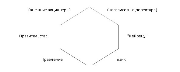 В отличие от англо-американской модели, независимые акционеры практически не в состоянии повлиять на дела корпорации. В результате этого действительно независимых акционеров, т. е. директоров, представляющих независимых (внешних) инвесторов, мало. Схема японской модели выглядит как разомкнутый шестиугольник (рис.1.3).
